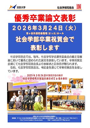 社会学部卒業祝賀会で表彰します開催日: 2026年3月24日(火) 会場: 市ヶ谷外濠校舎薩埵(さった)ホール 社会学同窓会では、毎年、社会学部学会運営委員会の厳正な審査において優秀と認められた論文を表彰しています。卒業祝賀会会場にて社会学部同窓会長より表彰状と記念品が贈られます。